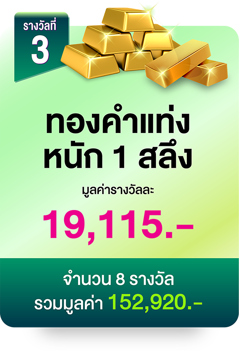 รางวัลที่ 3 : ทองคำแท่ง หนัก 1 สลึง จำนวน 8 รางวัล รางวัลละ 19,115 บาท รวมมูลค่า 152,920 บาท