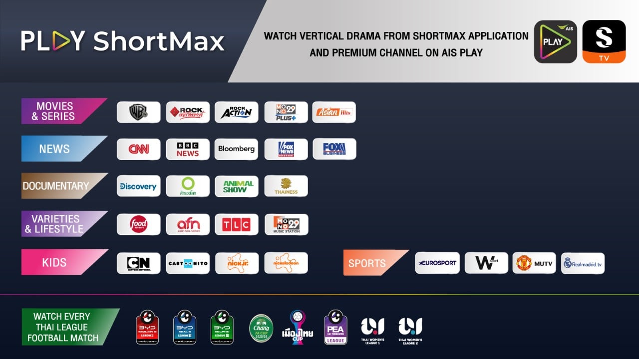 PLAY ShortMax package is for simultaneous use on 1 screen at the same time per account for watch premium channels on AIS PLAY on up to one device, can watch via the website at https://aisplay.ais.co.th/portal, Apple TV, Samsung Smart TV, and Chromecast for big-screen viewing, or via the AIS PLAY mobile application on supported devices running Android 4.4 or later, and iOS 10.2 or later. The app is available for download on the App Store and Google Play Store.