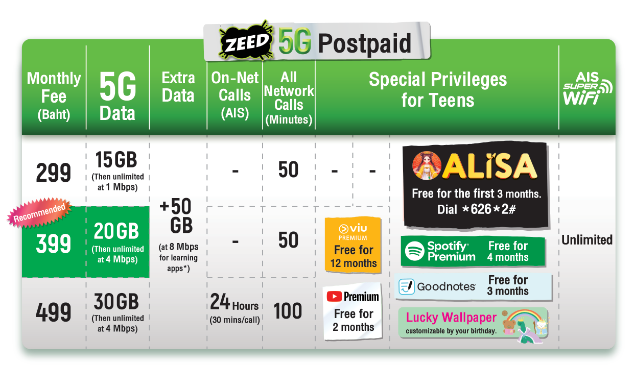 Customers who activate a new ZEED 5G postpaid number or port in to ZEED 5G postpaid and subscribe to a monthly package of THB 299 or above are eligible to subscribe to Alisa Premium and receive the first 3 months free of charge. After the free period, a special monthly fee of THB 220 (regular price: THB 420), VAT included, will be applied for 12 months, when the subscription is made via USSD *626*2# within 30 days from the date of receiving the SMS notification, with payment through AIS mPAY Mobile Payment.