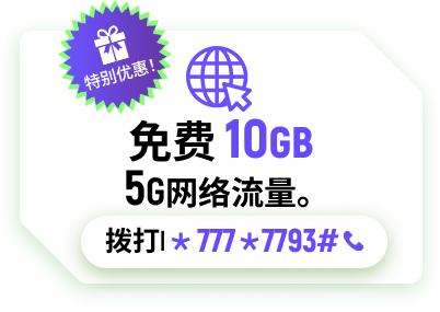 3. 特别优惠:额外加赠10GB的5G网络流量。在套餐办理或成功支付后7天内,拨打*777*7793#即可激活。每月限兑换一次。每月流量礼包到期后重新激活。赠送的10GB流量包有效期为30天。