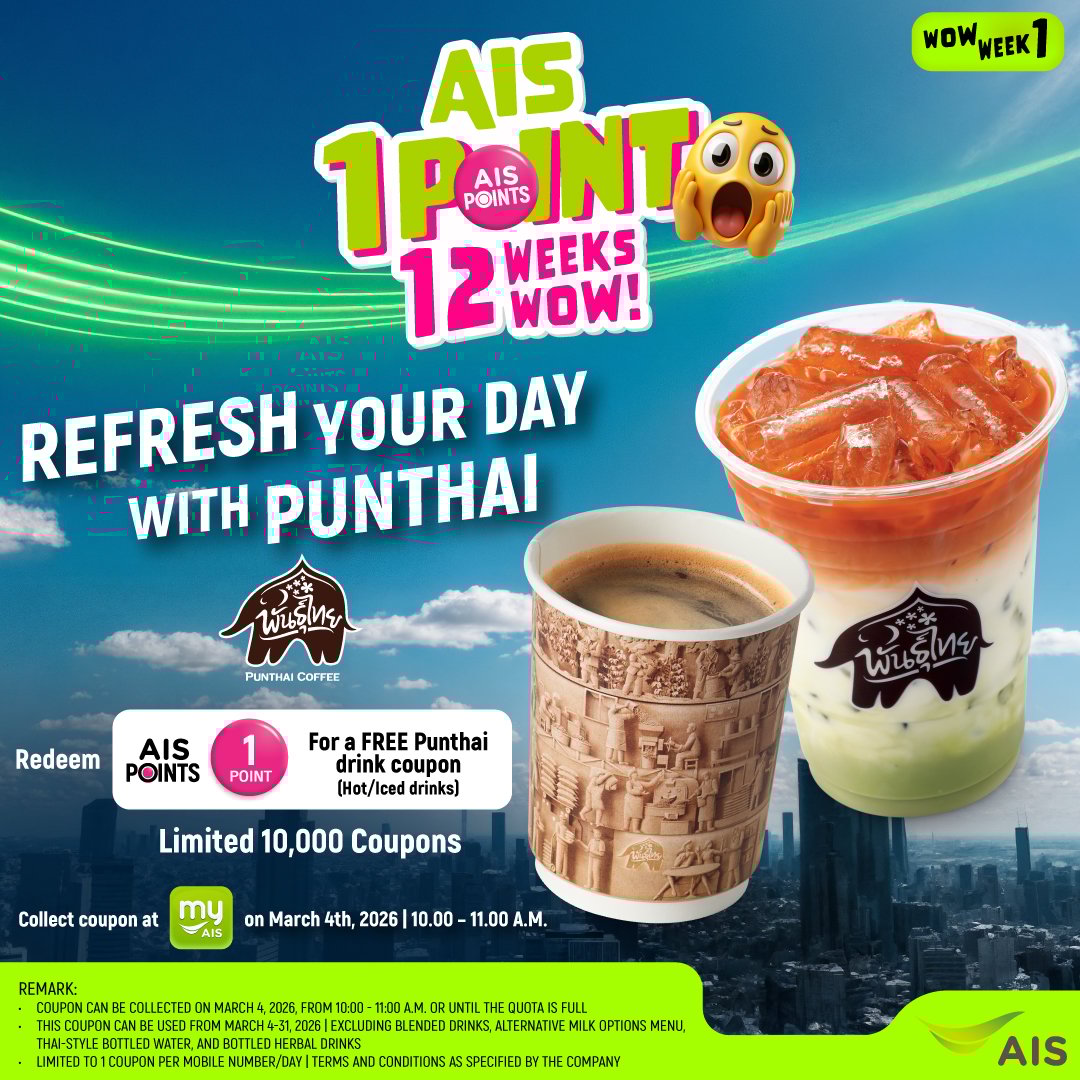 - Limited to 1 coupon per mobile number /day (postpaid customers under group billing are limited to 1 coupon per bill) under the AIS 1 POINT 12 WEEKS 12