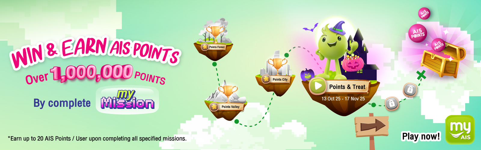 Customers who check in via the myAIS application each week will receive 2 AIS Points. If a customer checks in continuously for 4 consecutive weeks, they will receive an additional 2 bonus AIS Points in the 4th week. This brings the total to 10 AIS Points for the full 4-week period. If the customer misses any week within the 4-week cycle, the bonus points will not be awarded.