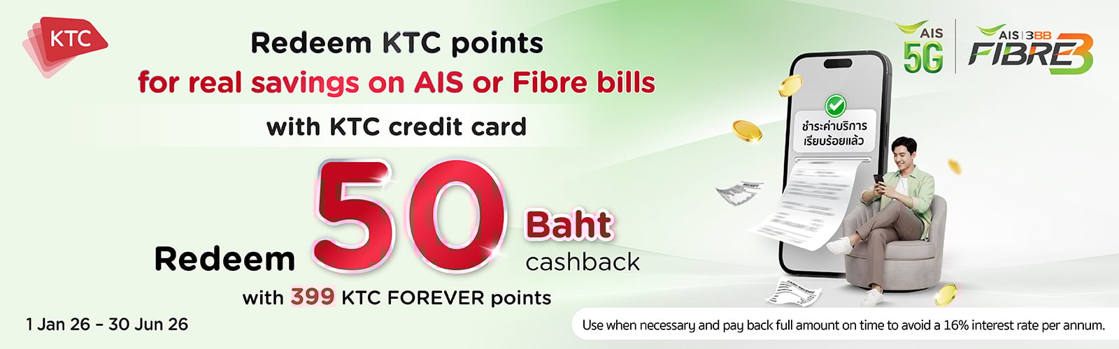 or more with a KTC credit card and redeeming KTC FOREVER 399 points to receive 50 baht cashback.