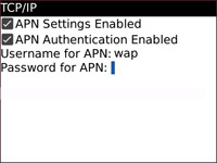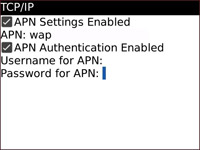 สำหรับ Blackberry บางรุ่นจะมีการใส่ wap มาอยู่แล้ว ให้ใส่ ลงไปในช่อง APN Settings Enabled และ APN Authentication Enabled ตามรูป แล้วทำการ SAVE
